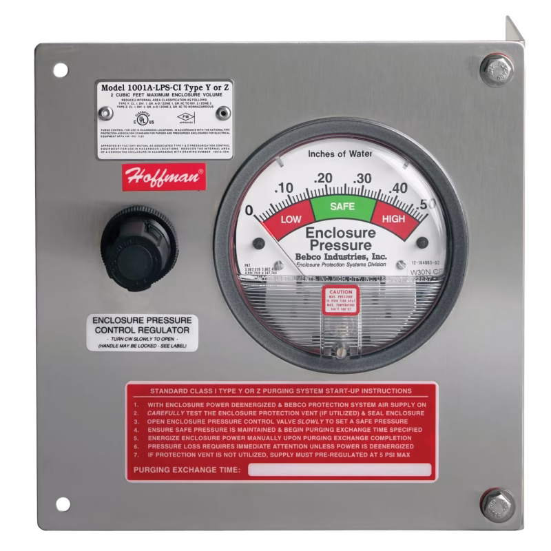 El sistema de purga/presurización de gran volumen suministra a uno o más gabinetes, hasta un volumen total de 90 pies cúbicos, con un suministro de gas protector, lo que permite el uso de gabinetes de uso general en ciertas áreas peligrosas de Clase 1, División 1 y 2.